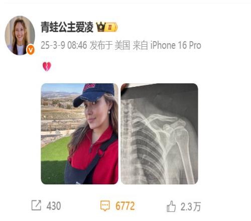 3月9日,谷愛凌發了一條微博,沒有文字,只有一個心碎的表情,一張手臂綁著吊帶的照片,還有一張鎖骨骨折的X光片。